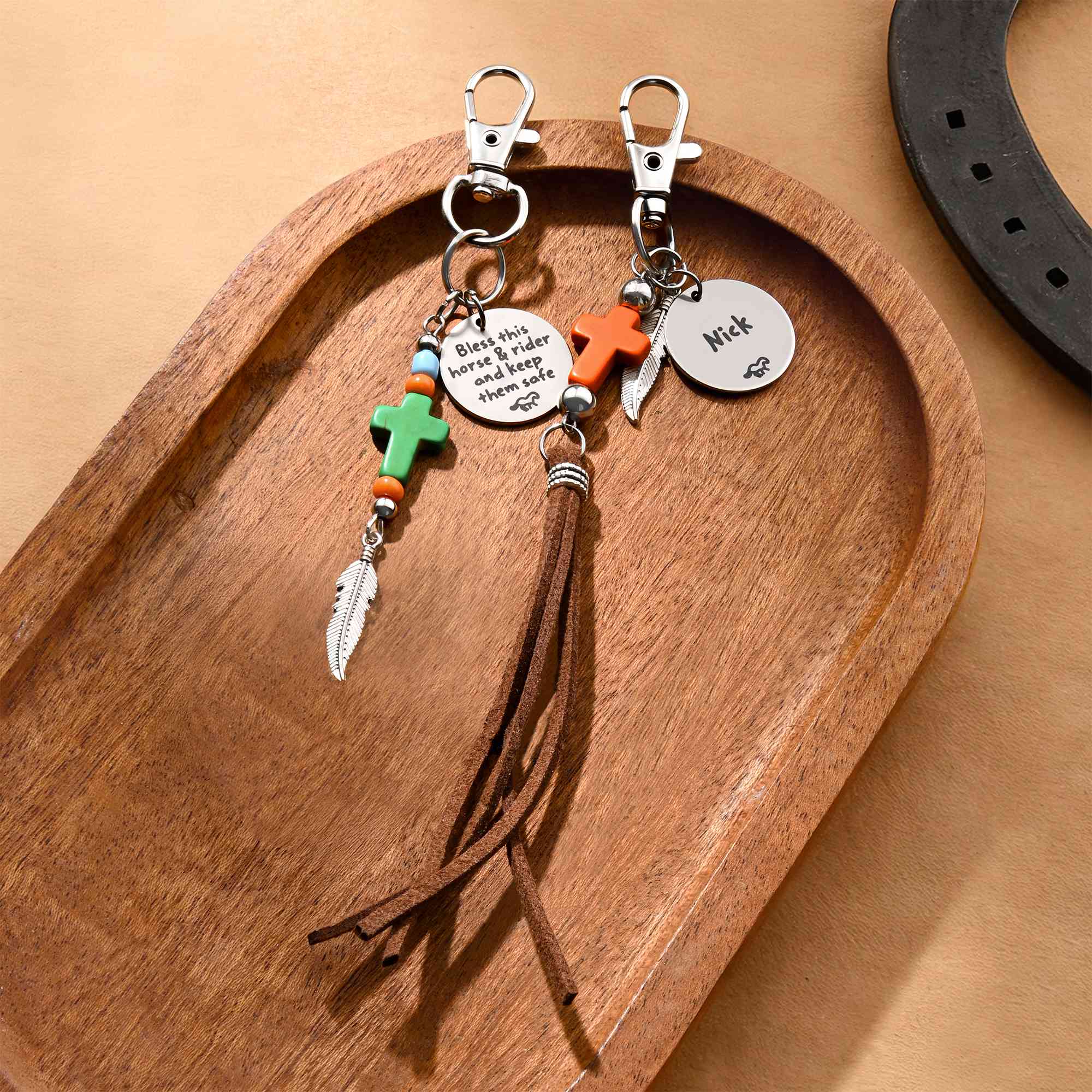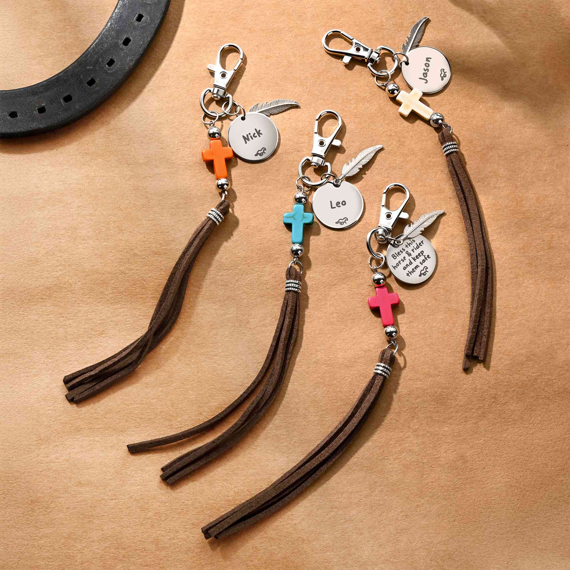 Faith-Inspired Western Design - The cross charm paired with a blessing message symbolizes protection, faith, and love for horse and rider. The bridle-inspired style, feather or tassel detail, and cross accents reflect a classic horseback riding and Western aesthetic that feels meaningful and unique.
